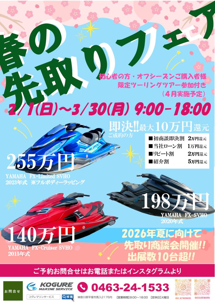 なんと2か月もの間、水上バイク中古艇「春の先取りフェア」を開催いたします。